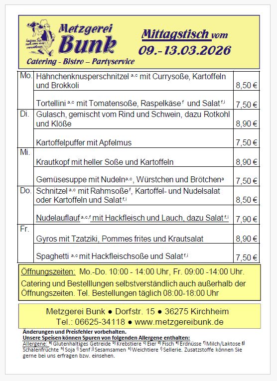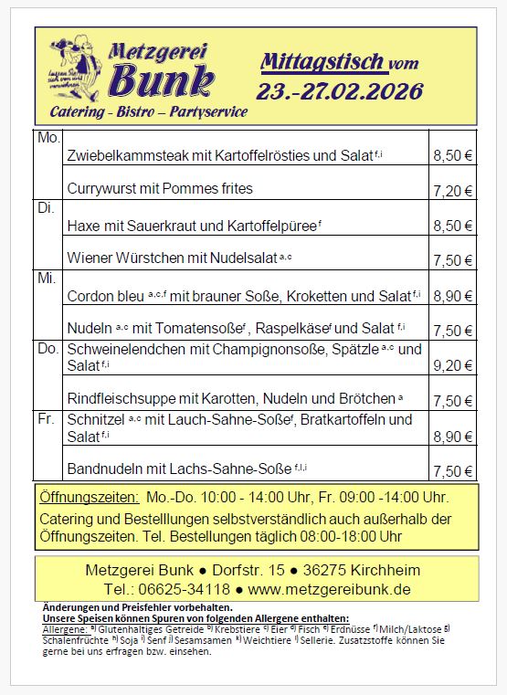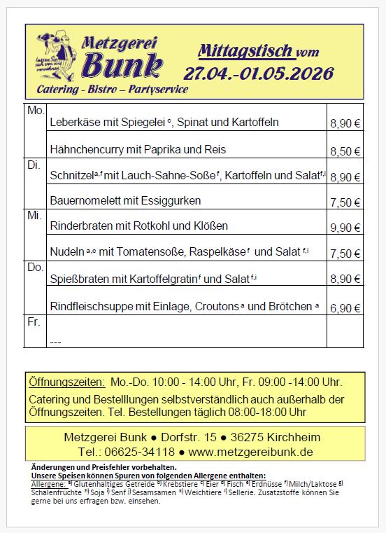Aktuelles Angebot weiterlesenHier finden Sie unsere wöchentlich wechselnden Angebote zum Mittagstisch. Wir haben täglich ab 11:30 Uhr frisch für Sie gekocht! Zwischen 11:30 Uhr und 14:00 Uhr können Sie unseren Mittagstisch genießen.